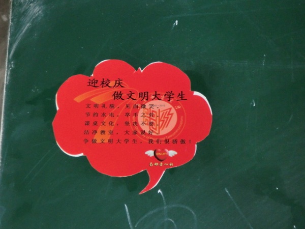 在“迎校庆,做文明大学生”系列活动中,爱心社成员还统计了教室空课表贴在各个教学楼,给同学们的自主学习带来了极大的方便;在操场上贴出了日常锻炼的小提示,提醒大家运动时的注意事项;在教室内张贴节水、节电、保护环境的小标语。爱心社通过这些细微处时刻提醒同学们文明行为习惯的重要性。