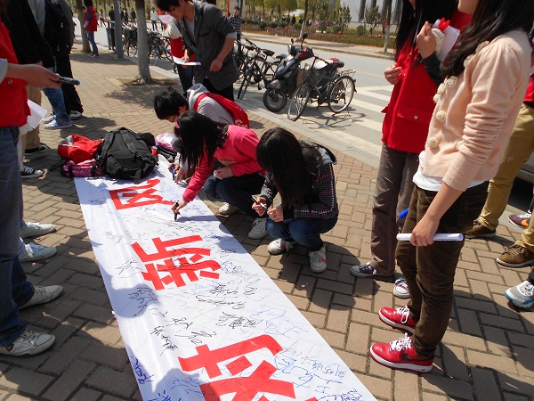 2012年3月29日,系列活动的外场宣传在南二广场举办。爱心社成员通过传单、展板图片等形式对文明习惯的倡导进行了大力宣传,现场人来人往,同学们纷纷驻足关注,在“讲文明,改陋习,迎校庆,树新风”的宣传横幅上签字,并表示会积极响应倡议,争做一个文明大学生。