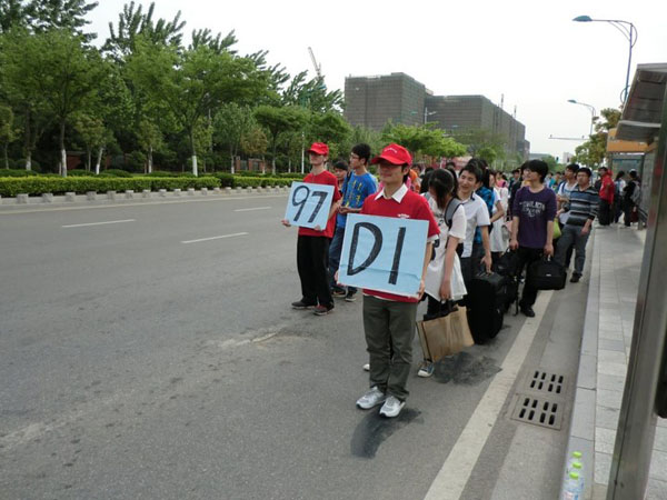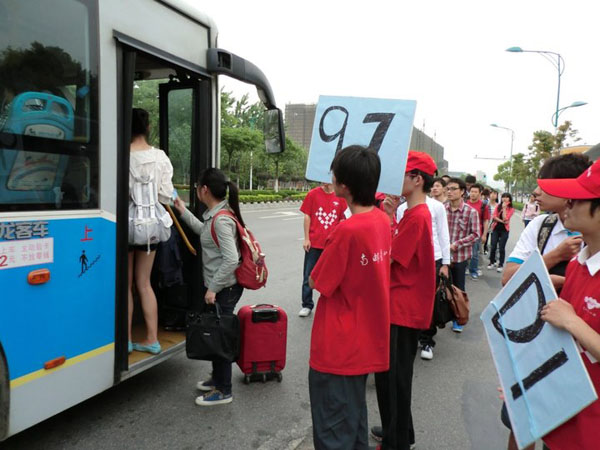 五一放假前夕是各高校学生回家的高峰期,大量的学生造成仙林地区交通的拥挤。早晨,南邮爱心社的社员放弃或延后假期回家的机会,按照原先的计划安排,在学校门口的公交站点组织乘客维持秩序。在场志愿者通过举牌疏导各乘车线路的乘客,使在公交车停靠站上等车的乘客都能够依次有序排队,文明乘车。活动过程中,志愿者们还不忘交通安全知识宣传,使得出行的广大同学既做到了有序乘车,安全出行,又具有良好的安全防范意识。