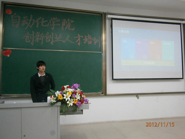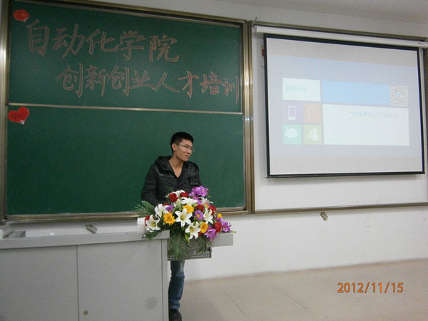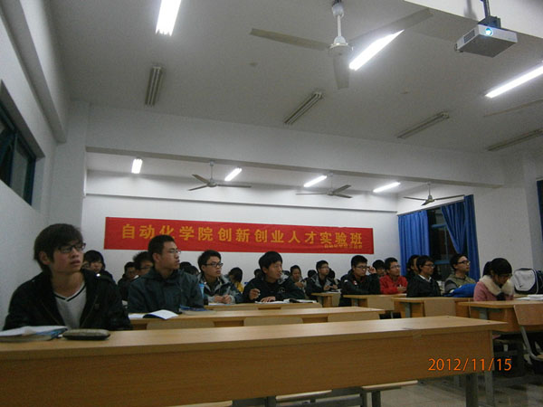 2012年11月15日,由自动化学院学生会实践部主办的“自动化学院创新创业人才实验班”在教4-208成功举行。此次活动特邀校学生会主席张杰、自动化学院学生会副主席乔升担任主讲嘉宾。