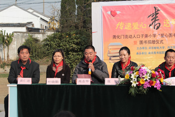2012年11月29日下午,在12·5国际志愿者日来临之际,由南京邮电大学和南京图书馆主办、南京邮电大学爱心社和南京图书馆团委承办的 “爱心图书角”捐建暨图书捐赠仪式在尧化门流动人口子弟小学举行。南京邮电大学团委副书记张敏、自动化学院党委副书记高志华、自动化学院分团委书记叶晓勤和南京图书馆读者服务部主任朱志伟、南京图书馆团委副书记赵曾以及尧化门流动人口子弟小学校长胡德宝和教导主任黄仁进出席了本次仪式。