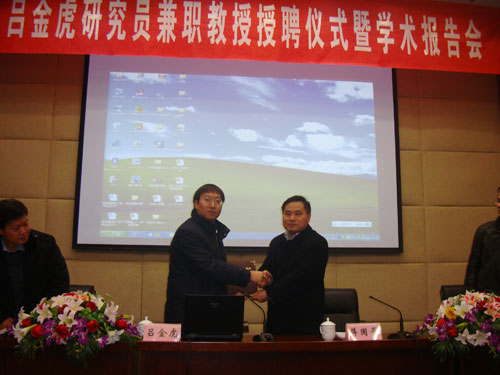 | 12月24日,国家杰出青年基金获得者吕金虎研究员兼职教授受聘仪式暨学术报告会在我校仙林校区行政楼一楼报告厅隆重举行。副校长蒋国平教授出席受聘仪式,仪式由人事处处长周健主持。 吕金虎研究员现任职于中国科学院数学与系统科学研究院,是国际上享有一定学术声誉的复杂网络领域内中青年专家,在国际著名学术刊物发表SCI杂志论文100余篇,著有四部学术专著,近年来在相关复杂网络领域内取得了一系列引人注目的研究成果。 蒋国平副校长代表学校向吕金虎研究员颁发聘书并致辞。蒋副校长表示,南邮师资队伍建设目标是要建设一支数量充足,结构合理,在国内具有一定影响力的高水平师资队伍,吕金虎研究员的到来,一定会对南邮复杂网络方向和控制学科的发展起到巨大的推动作用。 吕金虎研究员为加盟南邮感到高兴。他说,加盟南邮是一个机遇,自己一定抓住这次机遇,把自己最新的研究与南邮师生互动交流,并欢迎南邮的师生到中国科学院数学与系统科学研究院交流。 受聘仪式后,吕金虎研究员为在座师生作了题为“网络科学:机遇与挑战”的学术报告。在介绍了复杂网络的研究背景后,吕教授从智能电网、物联网、移动互联网中存在的问题出发,分析了目前复杂网络中研究的热点问题,对复杂网络的发展趋势进行了展望,精彩的报告赢得了在座师生的阵阵掌声。 校相关职能部门负责人、自动化学院领导及部分师生参加了聘任仪式并聆听了学术报告。 吕金虎研究员简介:吕金虎,研究员,博士生导师,IEEE Fellow、国家杰出青年科学基金获得者,中国科学院“百人计划”入选者。2002年获中国科学院研究生院博士学位。2002年至今任中国科学院数学与系统科学研究院博士后、助理研究员、副研究员、研究员。其中,2004-2005年任加拿大卡尔加里大学博士后;2005-2006年任美国普林斯顿大学Visiting Fellow;2006-2009年任武汉大学“珞珈学者”兼职教授、博士生导师、武汉大学复杂网络研究中心主任;2007年任法国Le Havre大学访问教授;2010年至今任澳大利亚皇家墨尔本理工大学兼职教授。 主要从事动力学与控制、复杂网络等方面的研究。主持或参加过973项目、基金委创新群体、重点和面上项目。发表及接受发表SCI杂志论文100余篇,专著4部,授权专利2项。SCI引用5500余次,h指数38,18篇论文单篇SCI引用超100次,19篇入选2001-2011 ISI高影响力论文,两次获中国学者SCI单篇被引次数排名第一。代表工作入选“中国科学院建院60周年成果展”(2009)和IEEE电路与系统学会“电路与系统进展”(2005)。先后任11个SCI杂志的各类编委,包括IEEE Trans. Circuits Syst. I、IEEE Trans. Circuits Syst. II、IEEE Trans. Neural Networks、IEEE Trans. Industrial Informatics、PLoS Computational Biology(IF=5.215)、自动化学报等。现任IEEE神经系统与应用技术委员会主席、中国电子学会云计算专家委员会委员、中国工业与应用数学学会复杂系统与复杂网络专业委员会(筹)副主任、中国自动化学会青年工作者委员会副主任委员等。 曾获IEEE Fellow (2013)、两项国家自然科学二等奖(2012, 排名1, 已通过国家奖励委员会审定; 2008,排名2)、光华工程科技奖"青年奖"(2012)、中国青年科技奖(2009)、澳大利亚ARC Future Fellowship奖(2009)、教育部自然科学一等奖(2007,排名1)、北京市科学技术一等奖(2007,独立)、全国优秀博士学位论文奖(2004)、中国科学院卢嘉锡青年人才奖(2008)、茅以升北京青年科技奖(2008)、"Scopus Young Scientists"信息科学金奖(2009)、中国科学院院长特别奖(2002)、关肇直青年研究奖(2007)等。    |