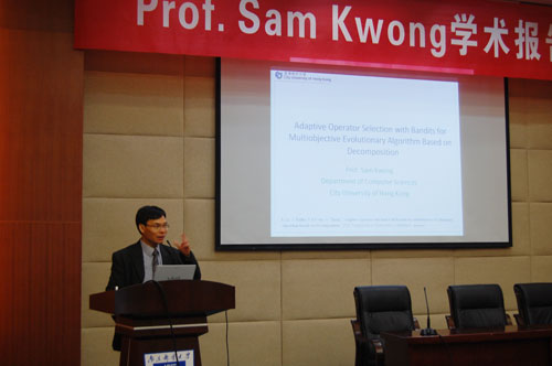 | 3月27日上午,应自动化学院与理学院邀请,香港城市大学计算机系主任Sam Kwong教授访问我校。在仙林行政楼一楼学术报告厅,Kwong教授为我校师生奉献了一场以“Adaptive Operator Selection with Bandits for Multiobjective Evolutionary Algorithm Based on Decomposition”为题的精彩学术报告。学术报告会由自动化学院副院长荆晓远教授主持。理学院李雷院长与赵洪牛副院长参加了报告会。 Kwong教授在报告中首先介绍了多目标优化算法的相关基本概念,然后结合在IEEE Transactions on Evolutionary Computation 2012年发表的论文,重点介绍了他所领导的课题组如何使用自适应的方法来提高多目标寻优效果的情况,最后Kwong教授详细介绍了相关最新研究工作和研究方向。报告会后,Kwong教授热情解答了老师和同学们所提出的各种问题。 主讲嘉宾简介:Kwong教授现任香港城市大学计算机系主任,在德国哈根大学获得博士学位。在视频编码、优化等相关领域发表了250余篇高质量学术论文,1997年编著的“Genetic Algorithm for Control and Signal Processing”获得了Springer出版社最畅销书的荣誉。他现在担任IEEE Transactions on Industrial Informatics, IEEE Transactions on Industrial Electronics, the Journal of Information Science等多个国际知名期刊的副主编。  |