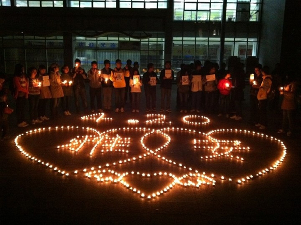 2013年4月21日晚7点,南京邮电大学爱心社在南邮二食堂,为四川震区雅安进行祈福活动,为灾区受难的人们默哀,向因救灾而牺牲的战士致敬。