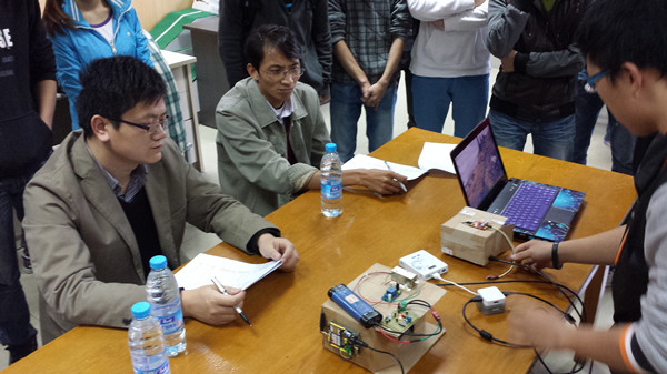 2013年11月6日下午1点30分,“创新杯院内选拔赛”正式拉开了自动化学院科技活动月帷幕。本次选拔赛邀请了自动化学院的周岩和徐国政老师担任比赛评委。经过前期的充分动员和准备,我院学生共有27支队伍报名参赛,创历届之最,为了争取进入校赛仅有的9个名额,各队选手各显才能,进行了充分的展示,评委老师对每件比赛作品做出了详细的点评和改进的建议。经过近两个小时的紧张评审,入选队伍尘埃落定。其中赖春伶组制作的激光键盘和唐德荣组的智能婴儿车不仅得到两位评委老师的青睐,也赢得了同学的一致好评。