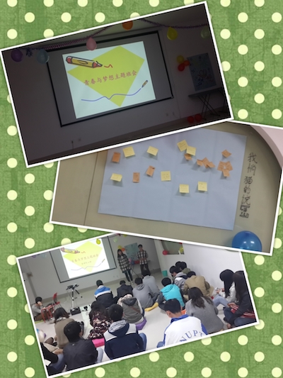 2014年11月11日,由自动化学院心理健康协会组织举办的以“青春与梦想同行”为主题的心理班会活动在我校心理活动室举行。本次活动主要面向自动化学院2013级学生。活动目的是通过多样化的团体心理活动,增强团队凝聚力、促进班级人际和谐,让学生在团体活动中体验青春与梦想,规划大学生活。