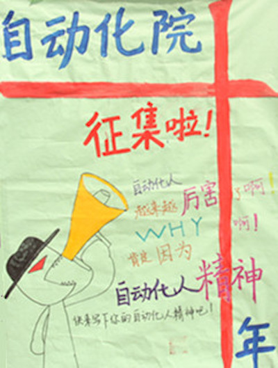 2015年4月9日至10日,南二广场人头攒动,热闹非凡。为庆祝建院十周年,自动化学院特在此举办“自动化学院精神”征集活动,借此鼓励同学们发扬自动化学院精神,再接再厉,共创学院新辉煌。