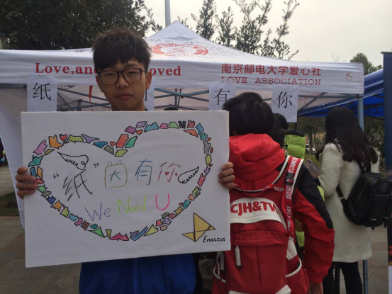 为了给栖霞区福利院的孩子们送去美丽的纸浆画并减轻环保型纸浆厂的运营负担,自动化学院爱心社和南京邮电大学Enactus创行团队联合举办的环保型公益活动——“纸”因有你,于2015年12月11日在南二外场正式拉开帷幕。