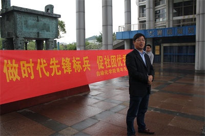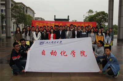 2016年10月15日上午,南京邮电大学自动化学院“青年先锋大课堂”活动正式拉开帷幕。上午8:15,自动化学院党委副书记杜月林老师、分团委书记汪颖老师、14级辅导员张逗老师、15级辅导员马骋老师以及所有学员来到学校南门大鼎处,参加了开课仪式。