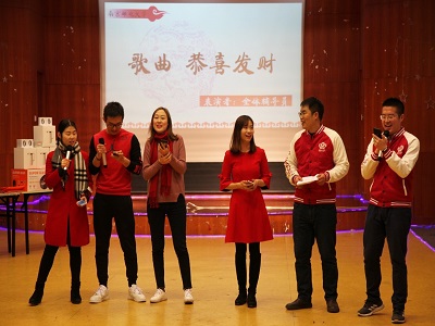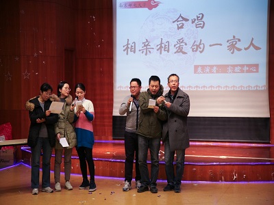 除却精彩的节目表演,各式各样的游戏环节更是为本场晚会带来了别样的乐趣,老师们配合默契,小组间互不相让,火药味引爆全场。最后实验中心的老师带来的一首《相亲相爱一家人》宣告了本场晚会的结束。