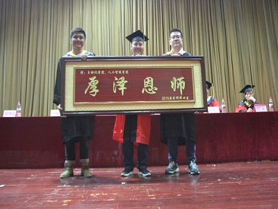 为表达对母校、老师的深厚情感,2018届全体本科毕业生集体向学院赠送了一块上书“厚泽恩师”的牌匾,以表示对学院和全体老师这四年来教导关怀的感恩之情。同时,学院也向11名校友联络员颁发了聘书,希望他们能够领着同学们常回母校,再忆当年。大会最后一项,学院领导向全体毕业生授予学士学位证书并合影留念,为他们的大学生涯做出最后的见证。