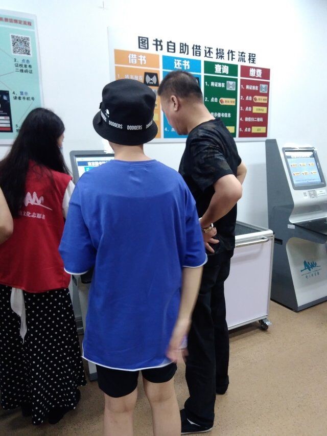 与此同时,另一队志愿者们为来往的读者讲解自助借还机的使用步骤。这项工作要求志愿者们以昂扬乐观的面貌对待每一位读者,热心解决读者碰到的每一个问题。长时间的站立和交流让志愿者们略感疲惫,但读者的每一句感谢与认同又给了他们坚持的动力。微笑,热心,坚持,是南京图书馆实践活动给予志愿者们的宝贵财富。