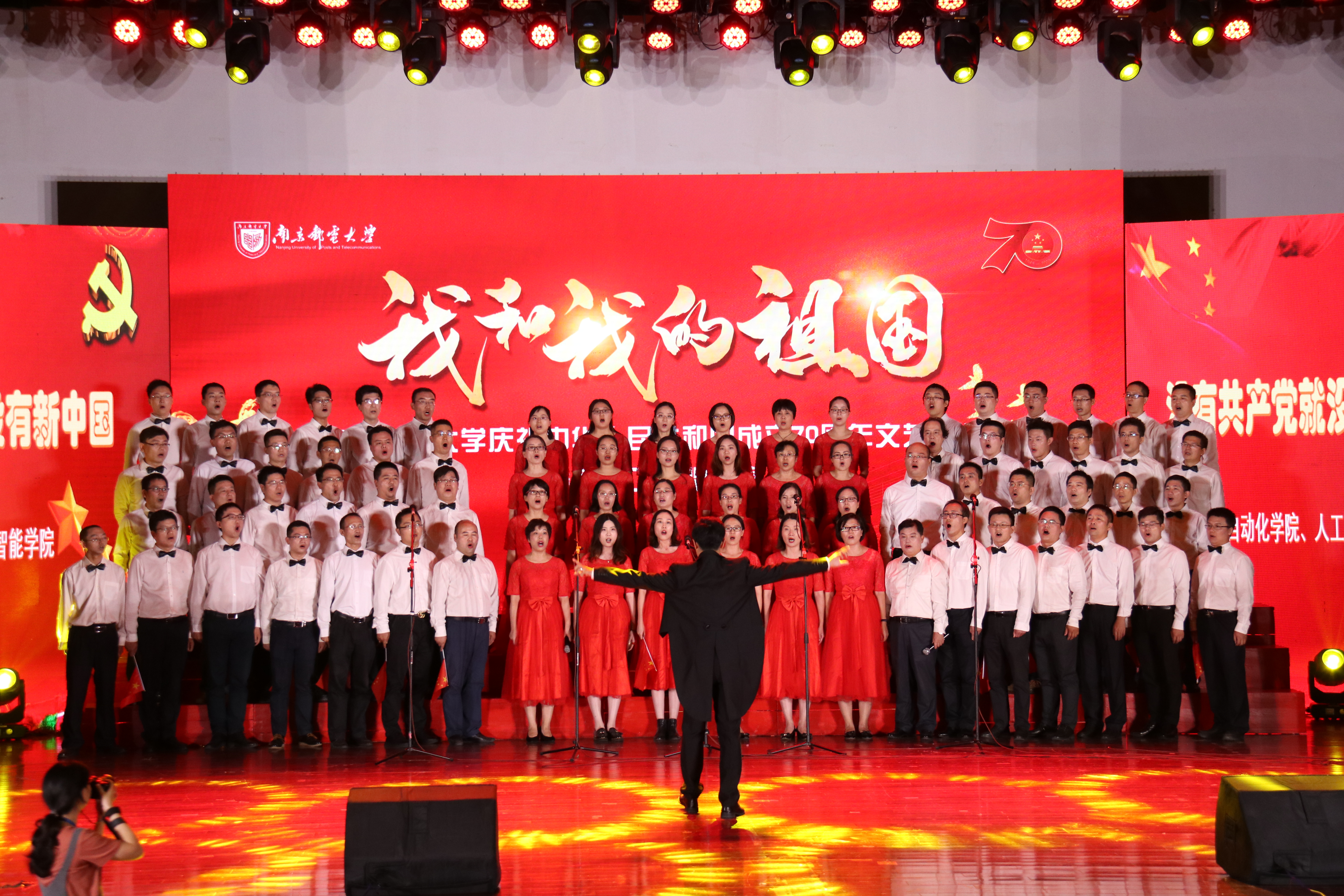 9月29日下午,仙林校区青春剧场,南京邮电大学庆祝中华人民共和国成立70周年文艺汇演暨教职工合唱比赛在激昂的啦啦操表演中拉开帷幕。