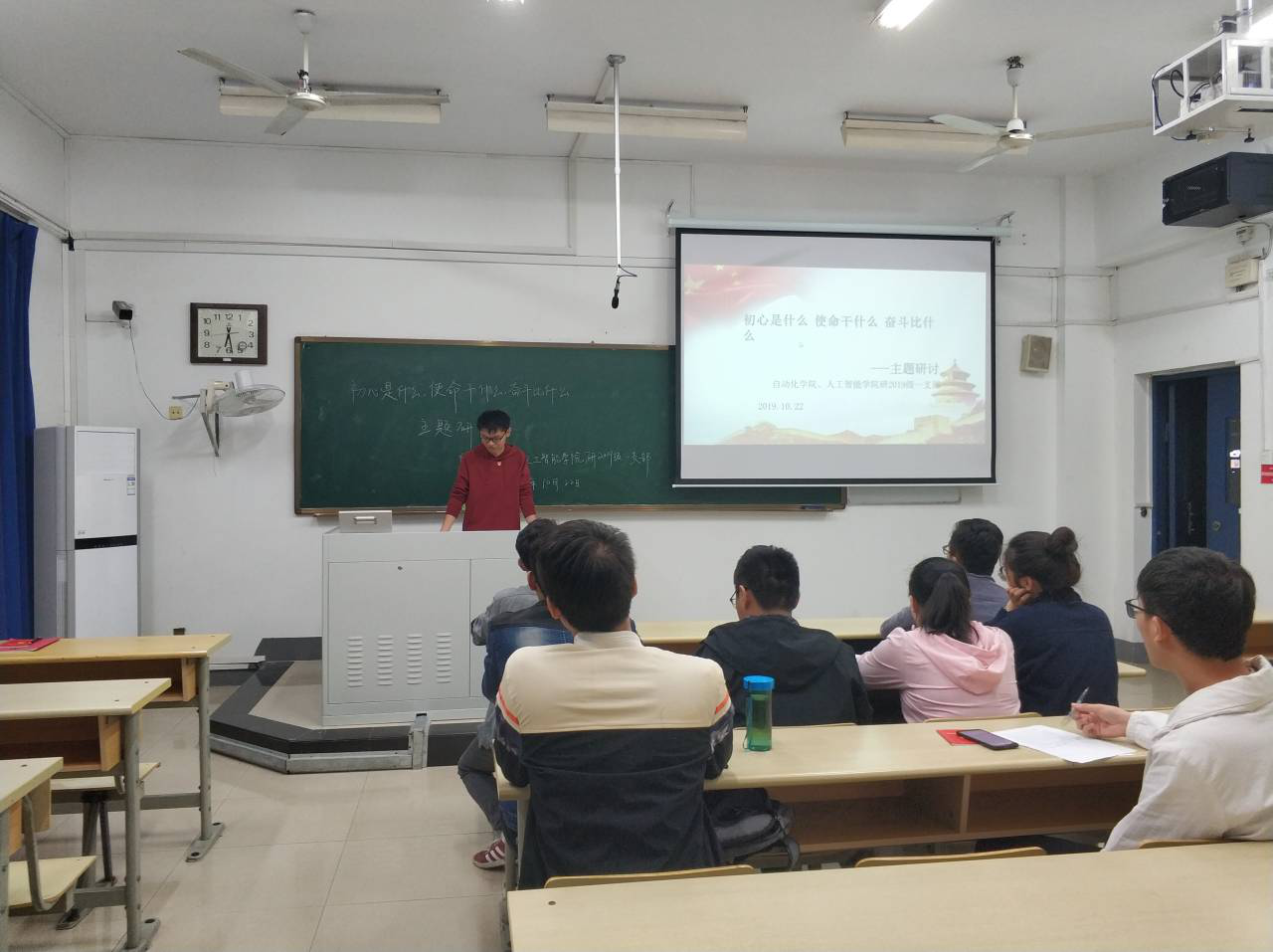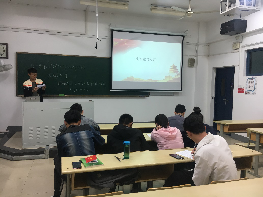 2019年10月22日晚6点半,自动化学院、人工智能学院研2019级一支部党员在教4-104组织开展“初心是什么,使命干什么,奋斗比什么”的主题研讨,支部书记刘良辰主持会议、交流心得体会。