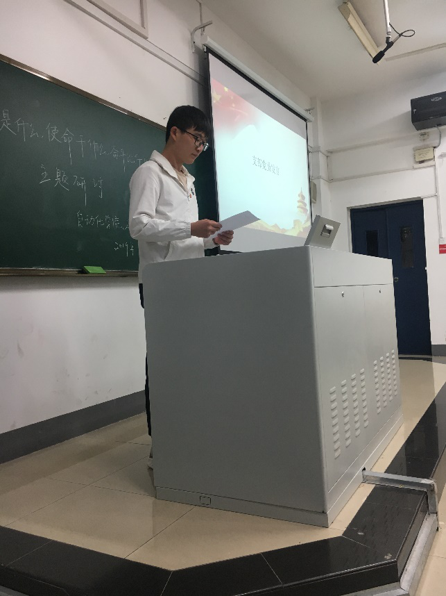 随后,支部党员们一起进行了主题研讨,每位党员都上台进行了发言,讲述了自己作为一名党员是如何看待初心、使命和奋斗。同学们一致认为初心使命是前进的导向,持续不断地奋斗是前进的动力,中华民族伟大复兴需要时代新人的不断努力才能够实现。