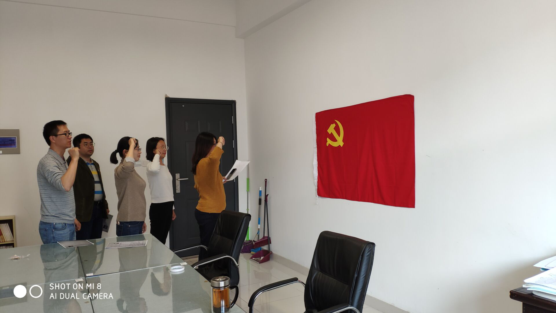 随后,全体党员佩戴党员徽章,面对鲜红党旗,由支部书记赵静同志领誓,全体党员同志进行了入党宣誓。在鲜艳的党旗下,所有人员重温入党誓词,庄严承诺、坚定决心,接受了再一次的心灵净化和洗礼。