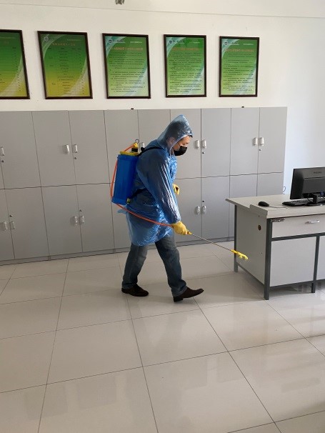 428日上午开始,中心全体老师首先领取了消毒用医用口罩、一次性手套、洗手液、消毒剂等防疫物资,按照学校防疫工作规定,定点放置在各实验室;在切断电源开关、紧闭门窗的情况下,对学院学科楼一楼、二楼全部的教学实验室,使用稀释的84消毒溶液进行整体实验室地面的喷洒消毒工作;同时,对消杀完毕的房间,作用30分钟以上后开窗通风。地面消毒完成后,实验中心老师轮流作业,先用酒精湿巾对仪器设备、桌椅、门窗把手等接触部位进行消毒作业,然后对地面进行卫生清洁,尽最大可能不留死角盲区。