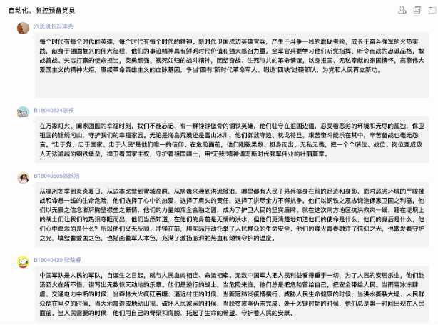 2020年6月,外军公然违背与我方达成的共识,悍然越线挑衅。五位卫国戍边英雄官兵的事迹在全社会引起强烈反响,深深感动着每一个人。自动化学院、人工智能学院各年级、学生党支部、学生组织(社团)自发开展戍边英雄事迹学习交流会、积极组织学习观看戍边英雄事迹、重读《谁是最可爱的人》、《在志愿军总部》等书籍。同学们写心得、谈体会,向英雄致敬。