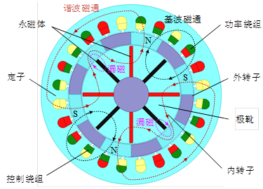 图 1永磁无刷双馈发电机拓扑及磁路图