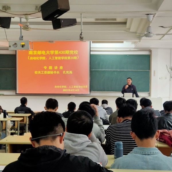 2021年4月14日下午,自动化学院、人工智能学院党委在教2-102开展了南京邮电大学第430期(学院第20期)党校专题讲座。本次讲座特邀校关工委副秘书长孔宪禹老师主讲,培训班全体学员参加了此次专题培训。