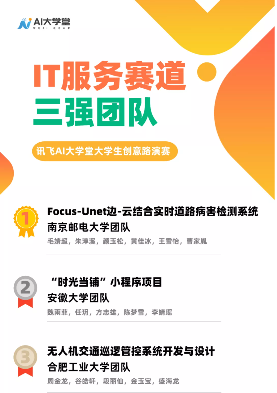 10月24日,讯飞AI大学堂大学生创意路演赛于合肥开幕启动,历经一个月的线上人气比拼,讯飞AI大学堂大学生创意路演赛IT服务、工业智能、智慧农业、智慧医疗、创新生活五大赛道的三强队伍均已产生,我院“Focus-Unet边-云结合实时道路病害检测系统”以超高票数从众多项目中脱颖而出,获得IT服务赛道第一名。