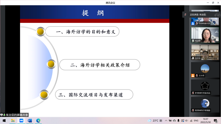 国合处朱治亚老师从海外访学的目的和意义、访学相关政策以及国际交流项目与发布渠道等三方面进行介绍。