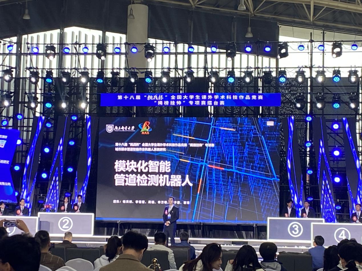 2023年10月,第十八届“挑战杯”全国大学生课外学术科技作品竞赛终审决赛在贵州闭幕。经过激烈角逐,我院报送作品“模块化智能管道检测机器人获城市排水管道智能作业机器人系统研究方向(发榜单位:武汉数字建造产业技术研究院有限公司)特等奖。