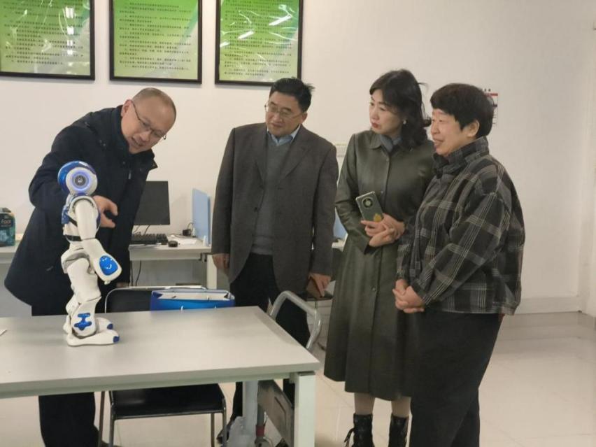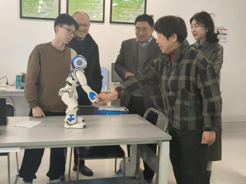 调研组观看了智能机器人科技比赛视频,体验了“听机器人讲故事“、“与机器人握手”等。郑春春、梁志伟老师分别代表学院介绍了我校大学生参与机器人科创比赛的近况及项目成果,展示了南邮学子的创新智慧与创新风采。