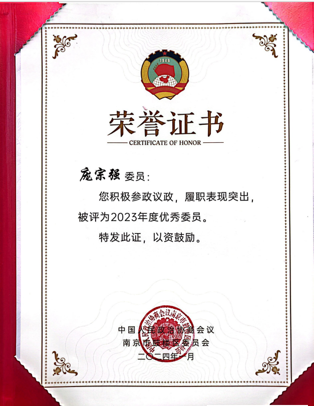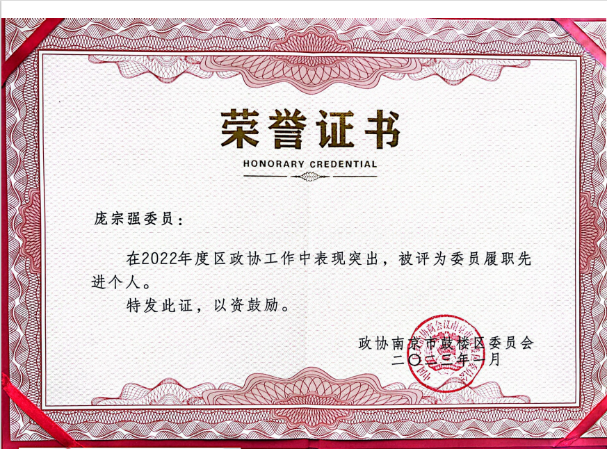 庞宗强副教授连续两年被评为鼓楼区政协委员履职先进个人