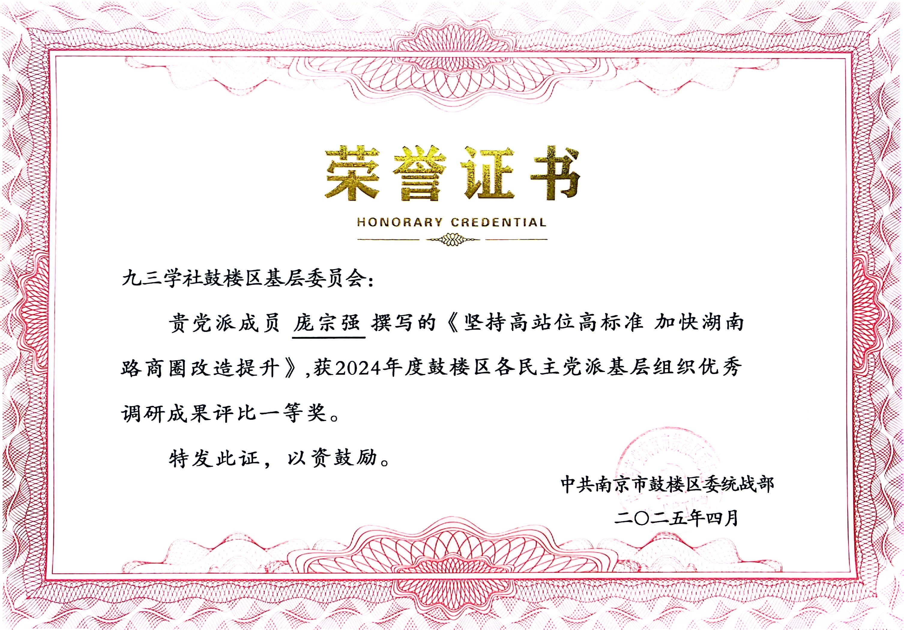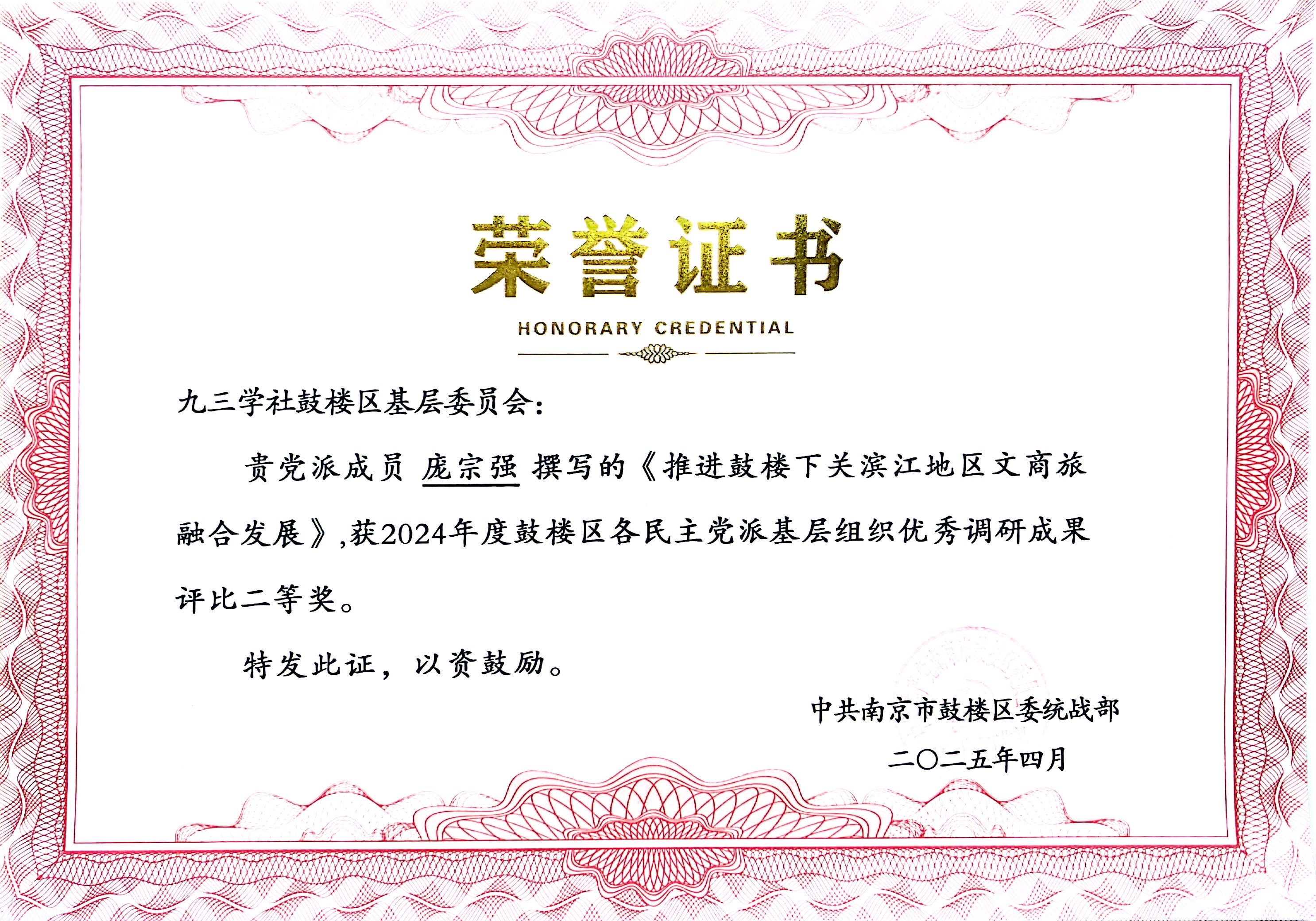 我院庞宗强老师三项调研成果获鼓楼区民主党派优秀调研成果奖