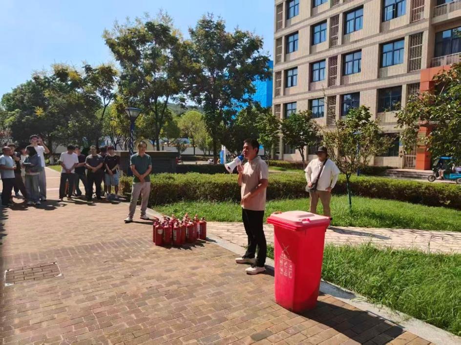 随后,学校保卫处张老师为在场师生进行了消防安全知识培训,强调了生命第一、财物第二、有序撤离的要点,特别是要防止发生踩踏等次生事故。他现场演示了干式灭火器的正确使用方法,介绍了使用灭火器时应站在上风方向,对准火焰根部进行喷射。